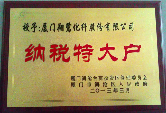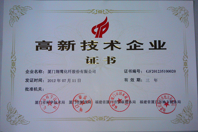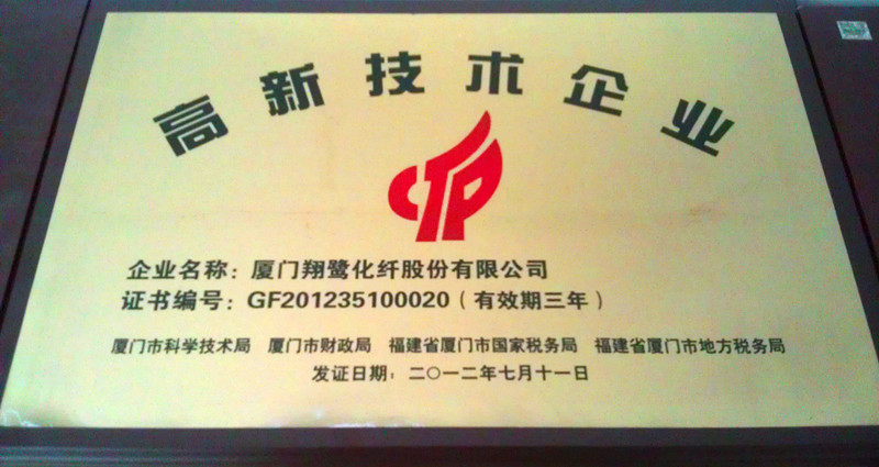祝賀翔鷺化纖榮獲“高新技術企業(yè)”“納稅特大戶”稱號根據(jù)《高新技術企業(yè)認定管理辦法》和《高新技術企業(yè)認定管理工作指引》有關規(guī)定及全國高新技術企業(yè)認定管理工作領導小組辦公室《關于廈門市2012年第二批高新技術企業(yè)復審備案申請的復函》現(xiàn)確認廈門翔鷺化纖股份有限公司為高新技術企業(yè),頒發(fā)“高新技術企業(yè)證書”授予“高新技術企業(yè)”稱號。